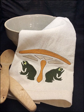 Kitchen towels are stitched on unbleached cotton muslin, measuring approximately 16" x 30". The designs are vintage designs developed during the Arts and Crafts era. The designs are stitched in fade-resistant polyester thread.